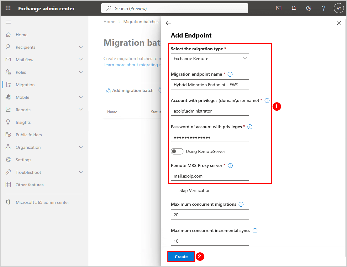 步驟 2. 在 Exchange Online 中創建遷移終結點