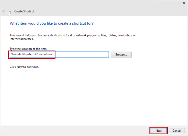 步驟2:當出現創建快捷窗口時,輸入%windir%\ system32 \ secpol.msc在空白框中並點擊下一個。