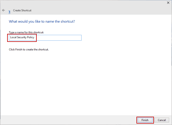 步驟3: 類型本地安全策略在名稱框中選擇結束創建此快捷方式。