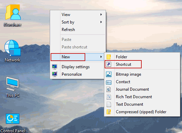 步驟1:右鍵單擊桌面上的空白區域,指向新的在上下文菜單中,選擇捷徑在子列表中打開新快捷方式。
