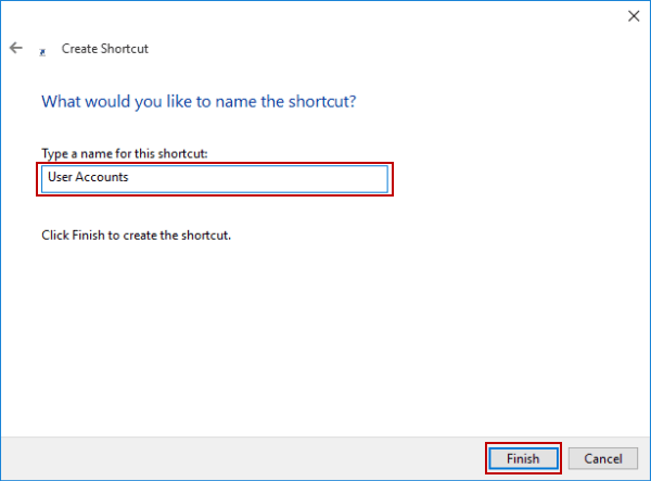步驟3: 類型用戶帳戶命名快捷方式並點擊結束至 Finish 來完成該過程。