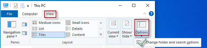 步驟 1:在桌面或通過“開始”菜單打開此電腦。單擊看法選項卡並選擇選項按鈕。然後選擇更改文件夾和搜索選項在上下文菜單中。