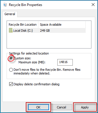 事實上,回收站的大小是有限制的。因此,如果刪除的文件在沒有人為乾預的情況下消失,則很可能是回收站大小超出了其最大值。在這種情況下,大尺寸文件將被簡單刪除,而不會進入回收站。要解決該問題,請展開最大尺寸回收站以存儲更多已刪除的文件。