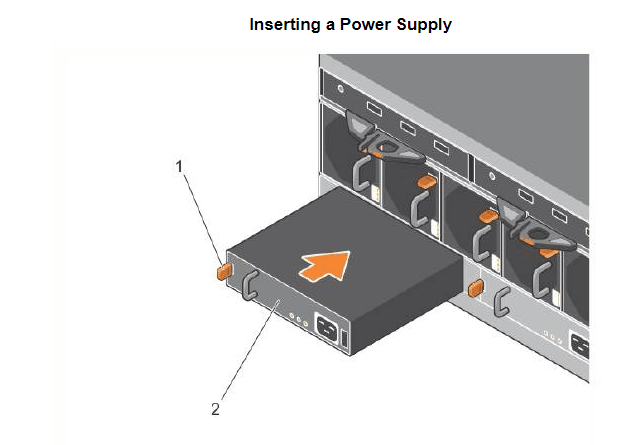 資料來源:Dell EqualLogic PS 系列硬件用戶手冊現在,在卸下有故障的電源裝置後,立即拿起新的電源裝置進行安裝。安裝新電源在電源開關仍處於關閉狀態的情況下,您將: 步驟 1. 握住電源裝置,使橙色釋放閂鎖 (1) 位於左上角。