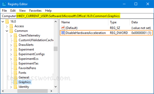 - 在左側窗格下,導航到以下註冊表項之一,具體取決於您的 Office 版本。如果圖形密鑰不存在,您必須手動創建它。