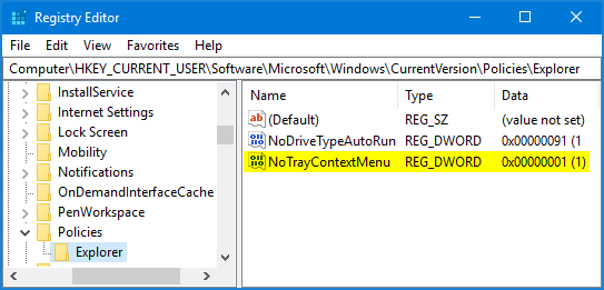 - 給它名字NotrayContextmenu然後單擊好的。然後雙擊名稱並將值數據設置為1。