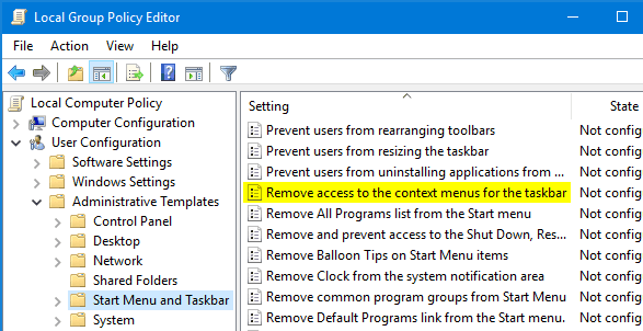 - 在本地組策略編輯的左側,導航到用戶配置>管理模板>開始菜單和任務欄,然後雙擊“刪除對任務欄上下文菜單的訪問”右側政策。