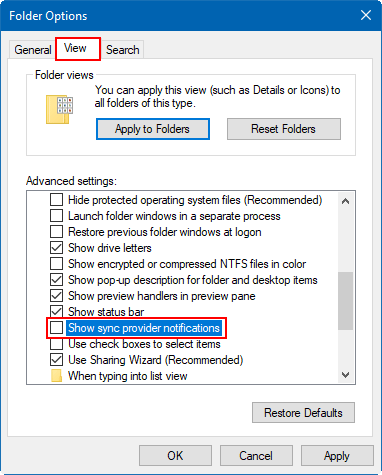 步驟 2:在文件夾選項中,單擊看法選項卡並取消選中“顯示同步提供商