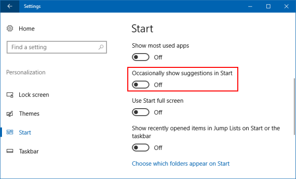 第 2 步:關閉偶爾在“開始”中顯示建議選項。