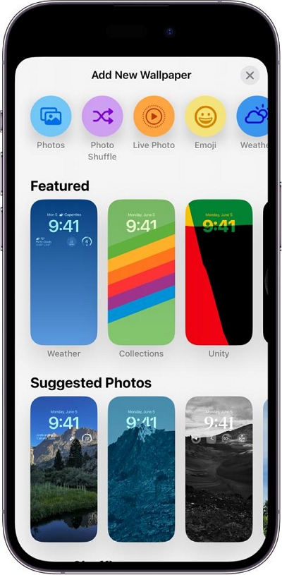 步驟 3.如果您想創建新的鎖定屏幕,請點擊顯示的壁紙選項之一,將其選為鎖定屏幕。如果您選擇“照片”或“照片隨機播放”,請參閱選項 2。