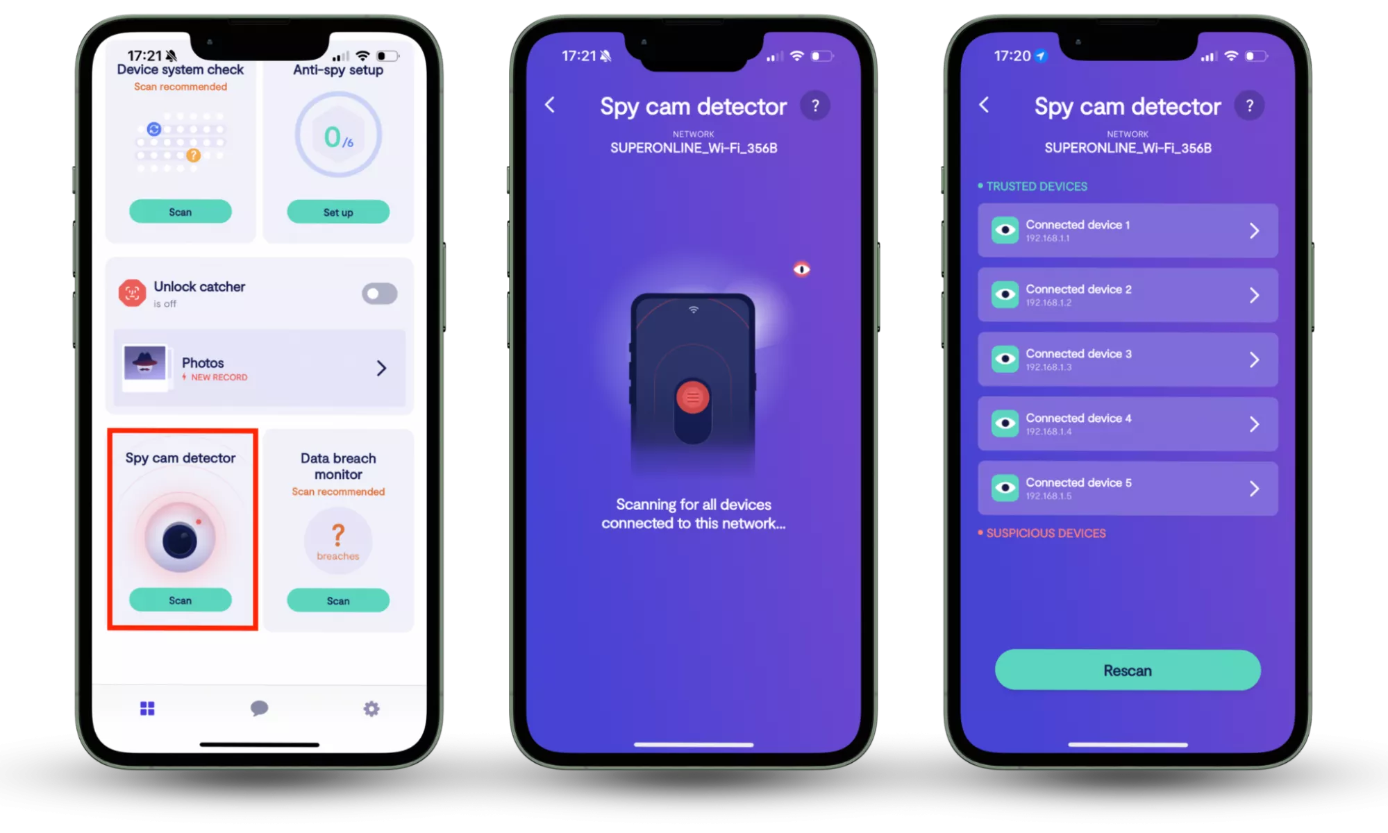 - 該應用程序將分析本地網絡上的所有設備,以確定是否有無線攝像頭。然後,如果發現任何可疑設備,它會向您顯示可疑設備的列表。