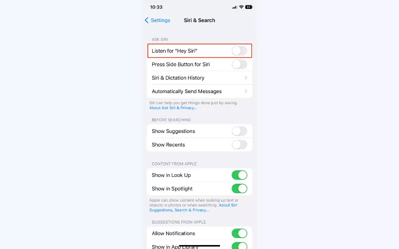 你可以阻止 Siri 收聽只需在您的設備上禁用它即可。如果您使用的是 iPhone,關閉 Siri 監聽在你的設定>Siri 和搜索。接下來,關閉聆聽“嘿 Siri”。查看這篇文章以了解更多信息。