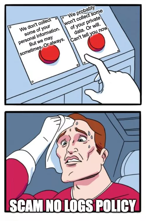 騙子從來不會清楚地說出他們收集了什麼,不收集什麼。他們的全部目的是使無日誌政策盡可能模糊,讓您認為既然服務聲稱遵守這樣的標準,他們就是好人,您可以信任您的金錢和個人信息。