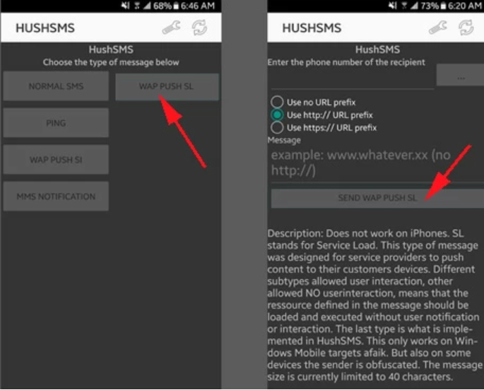 [電子郵件受保護]在新設備上安裝 HushSMS 應用程序單擊發送 WAP Push SL 並輸入鎖定設備的電話號碼。在消息字段中,輸入