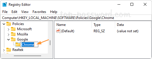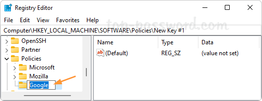 - 右鍵單擊Google並選擇新的->鑰匙,然後將其重命名為鉻合金。