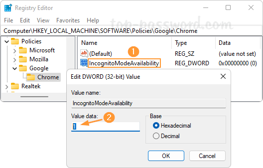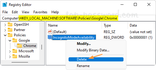每當您需要再次啟用隱身模式時,只需打開註冊表編輯器並導航至:HKEY_LOCAL_MACHINE\SOFTWARE\Policies\Google\Chrome,右鍵單擊隱身模式可用性右側窗格中的值並選擇刪除。
