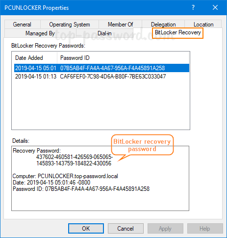 - 它將從 ' 檢索所有詳細信息msFVE-恢復信息' 附加到目標計算機的對象。這msFVE-恢復密碼item 是您要查找的 BitLocker 恢復密鑰。