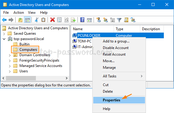 - 打開 Active Directory 用戶和計算機管理單元後,展開您的域並單擊電腦容器。右鍵單擊目標計算機對象並選擇特性。
