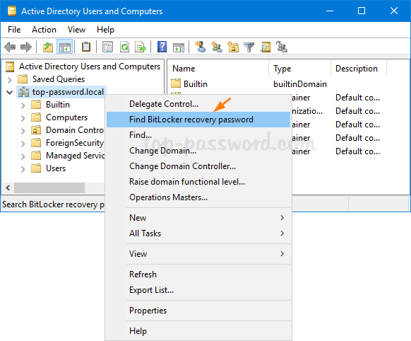 - 在 Active Directory 用戶和計算機管理單元的左側窗格中右鍵單擊您的域,然後選擇查找 BitLocker 恢復密碼。