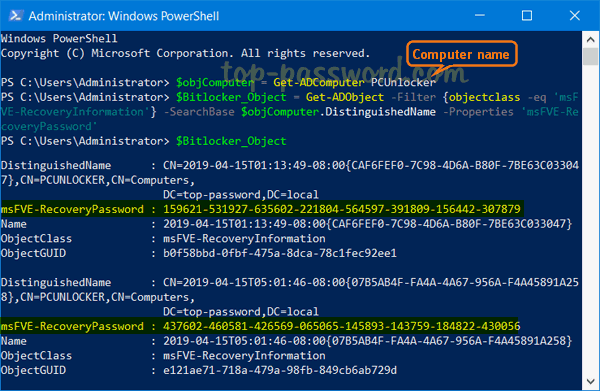 $Bitlocker_Object = Get-ADObject -Filter {objectclass -eq 'msFVE-RecoveryInformation'} -SearchBase $objComputer.DistinguishedName -Properties 'msFVE-RecoveryPassword'
