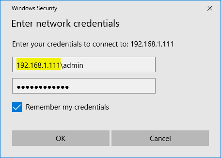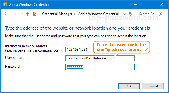 填寫您要訪問的網絡計算機的IP地址、用戶名和密碼。點擊好的保存您的憑據。筆記:您需要在“用戶名”文本框中輸入 IP 地址(或 PC 名稱)和用戶名。