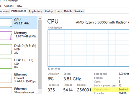 然後前往中央處理器任務管理器中的選項卡並檢查處理器兼容性:Virtualization: Enabled應在此處指定。