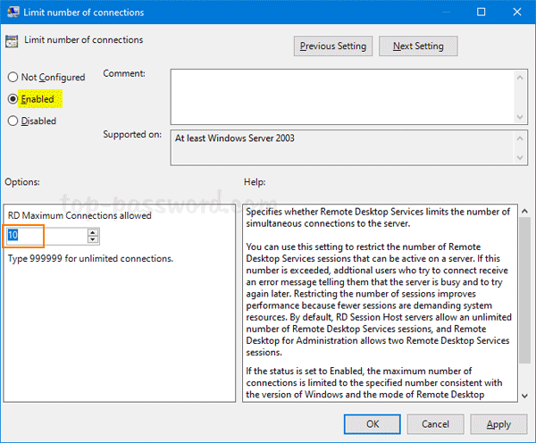 - 選擇啟用選項,您可以增加“RD 允許的最大連接數”。