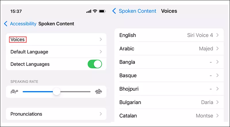當然,您還可以通過在 iPhone 上設置“語音內容”來自定義其他相關設置,例如語速,說話的聲音。