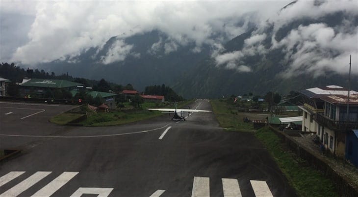 一架飛機從盧克拉機場起飛,“世界上最危險的機場”。盧克拉(Lukla)降落標誌著大多數遠足者在珠穆朗瑪峰大本營跋涉中的冒險開始