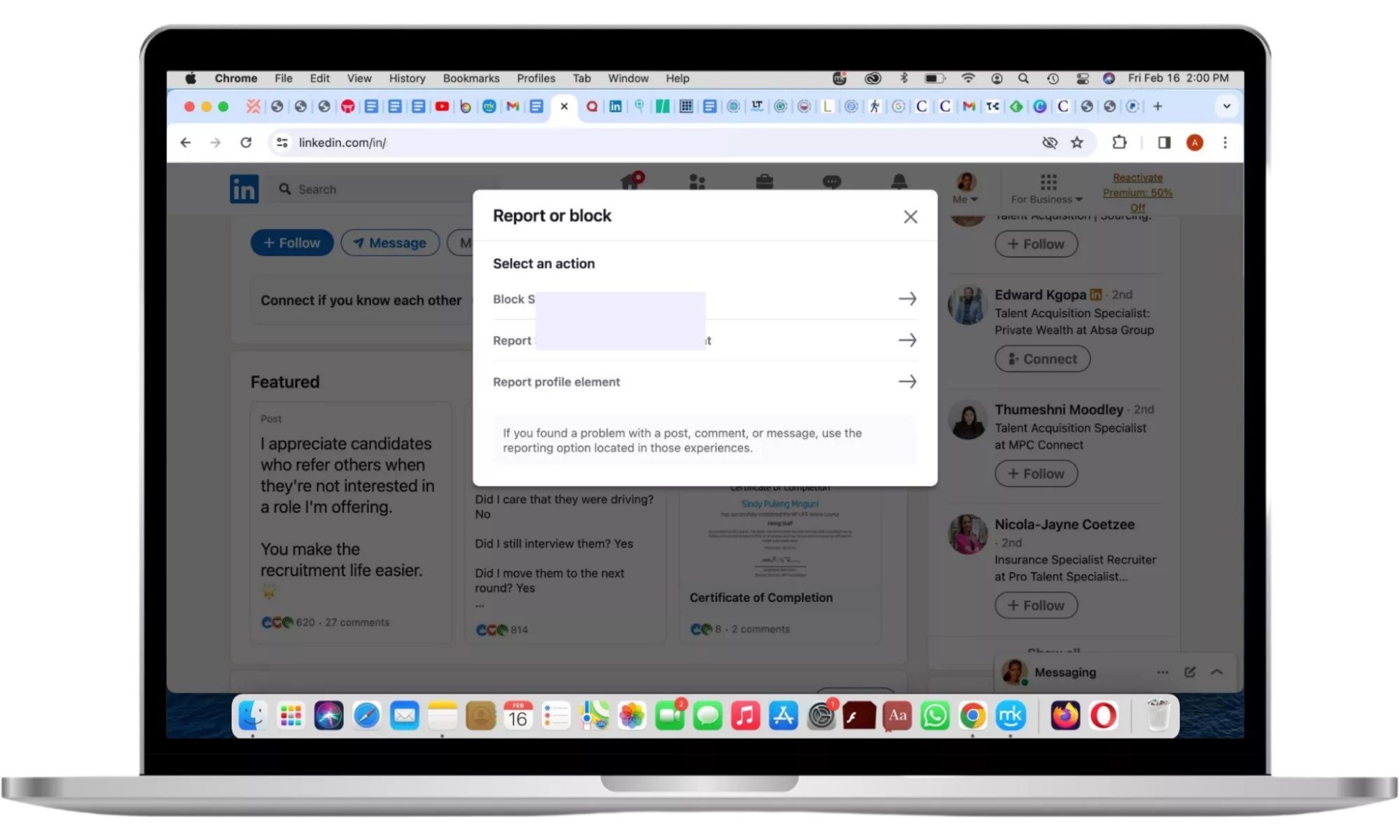 - 直接向LinkedIn報告跟踪行為。該平台具有無騷擾政策,因此報告該事件將促使LinkedIn進行調查。打開您的前任LinkedIn個人資料,然後單擊更多>報告/塊>報告配置文件元素,選擇適用的選項,單擊下一個,然後遵循提示。