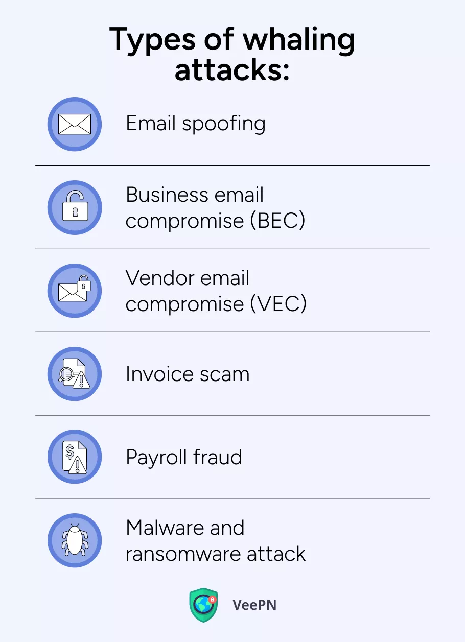 捕鯨攻擊使用收集公司信息、選擇特定員工、然後針對他們的常見原則,但詐騙者可以通過不同的方式來做到這一點。那麼讓我們來探討一下最常見的捕鯨攻擊類型。