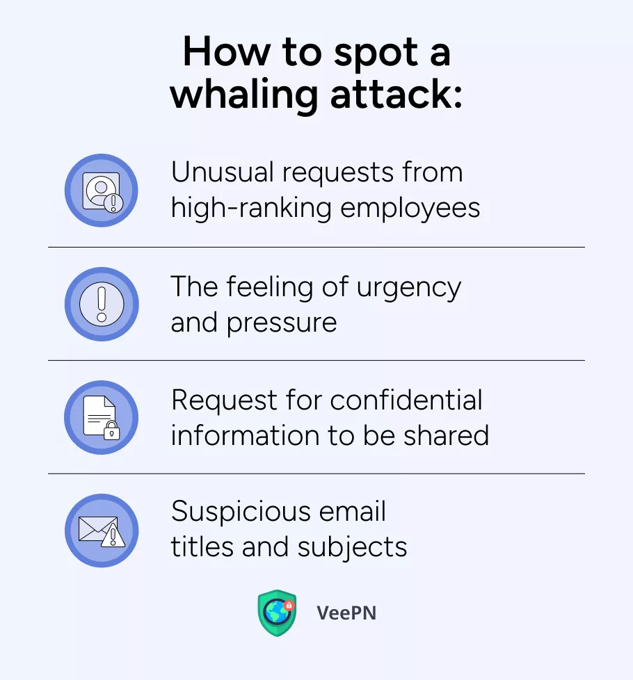 捕鯨攻擊可能看起來像常見的網絡釣魚計劃,但有一個明顯的區別。一個捕鯨網絡釣魚針對高管或高級管理人員等知名人士,並且經常使用與他們的角色相關的高度定制的消息,從而使其更難被發現。這些攻擊通常具有更高的風險,例如訪問機密商業信息或大額資金轉賬。