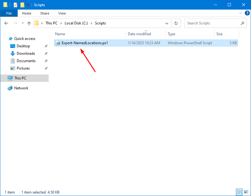 下載 Export-NamedLocations.ps1 PowerShell 腳本並將其放置在C:腳本文件夾。該腳本會將 JSON 文件導出到C:溫度文件夾。