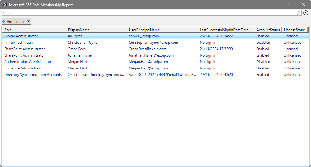$Report | Out-GridView -Title "Microsoft 365 Role Membership Report"