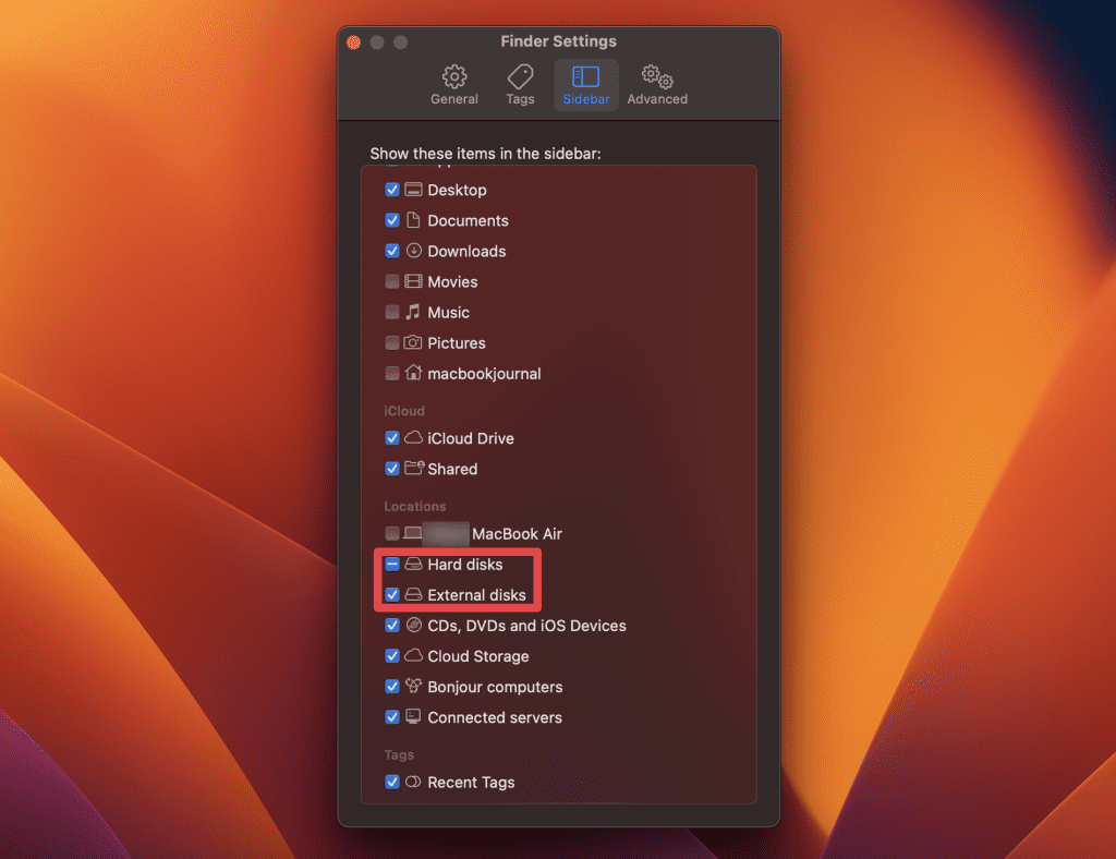 - 接下來,單擊側邊欄選項卡並選中旁邊的框硬碟和外部磁盤。
