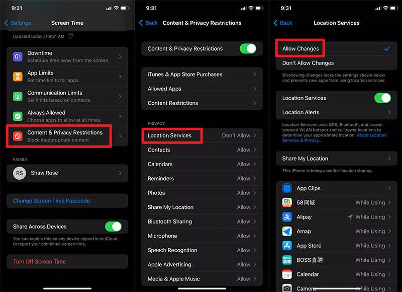 2. 點擊內容和隱私限制>定位服務,然後檢查允許更改。