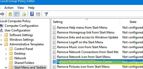 gpedit.msc)。 - 轉到用戶配置 -> 管理模板 -> 開始菜單和任務欄;