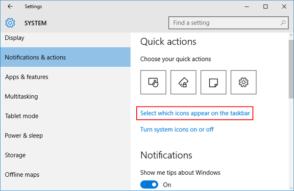 - 選擇通知和動作左側的標籤,然後單擊打開或關閉系統圖標右窗格上的鏈接。