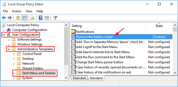 User Configuration -> Administrative Templates -> Start Menu and Taskbar - 按兩下拆除電池計”右窗格的政策,並將其設置為禁用。重新啟動計算機以應用您的更改。