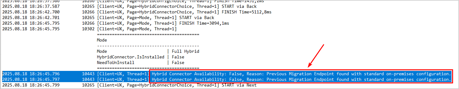 - 檢查日誌並找出問題。在這種情況下,在 Exchange Online 中找到了具有標準本地配置的先前遷移終結點。