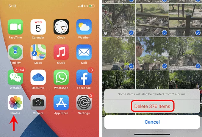 打開照片應用程序並刪除盡可能多不需要的照片和視頻。刪除之前,請將照片從 iPhone 傳輸到 PC 或 iCloud 進行備份,以防萬一。刪除後,重新啟動iPhone並檢查相機和手電筒是否正常工作。