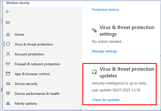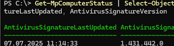 4. 確保防病毒定義數據庫是最新的:Get-MpComputerStatus | Select-Object AntivirusSignatureLastUpdated, AntivirusSignatureVersion