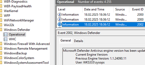 診斷問題時,在事件查看器中查看與防病毒相關的事件日誌會很有幫助:應用程序和服務日誌 -> Microsoft -> Windows -> Windows Defender -> 操作。例如,事件 ID 2002 表示防病毒更新成功。