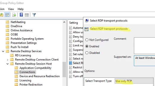 - 啟用策略選擇 RDP 傳輸協議並設置選擇傳輸類型=僅使用 TCP;