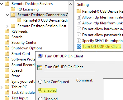 reg add "HKLMsoftwarepoliciesmicrosoftwindows ntTerminal ServicesClient" /v fClientDisableUDP /d 1 /t REG_DWORD