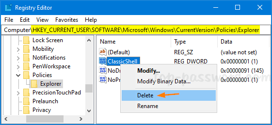 HKEY_CURRENT_USER\SOFTWARE\Microsoft\Windows\CurrentVersion\Policies\Explorer。在右側窗格中,找到 DWORD經典外殼並右鍵單擊它,然後選擇刪除從彈出菜單中。