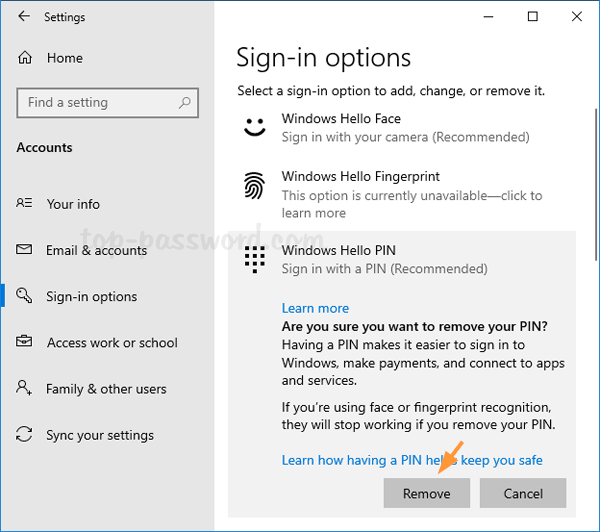登錄 Windows 10 後,打開“設置”應用程序並導航至賬戶->登錄選項。只需選擇Windows Hello PIN選項並單擊消除。