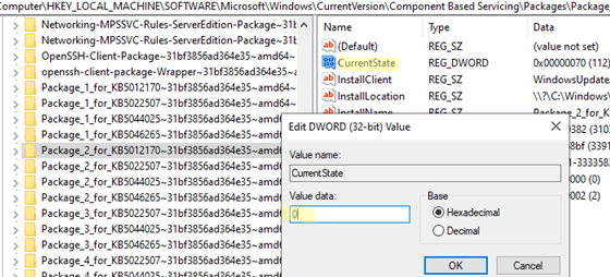 - 改變值當前狀態參數為0。這會通知 Windows 服務進程該組件既未安裝也未啟用。在我的示例中,包狀態的先前值是