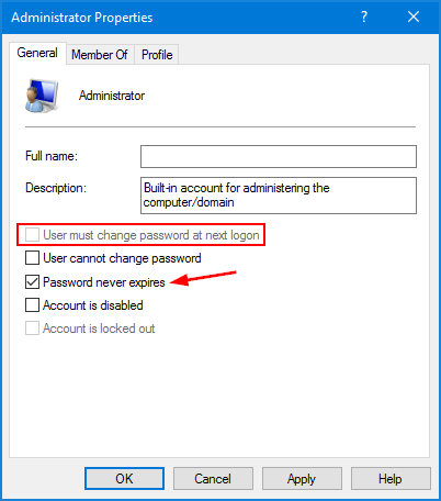 這將打開“屬性”對話框。取消選中“密碼永不過期” 框,然後您會找到“用戶下次登錄時必須更改密碼” 選項已啟用。單擊申請進而好的。