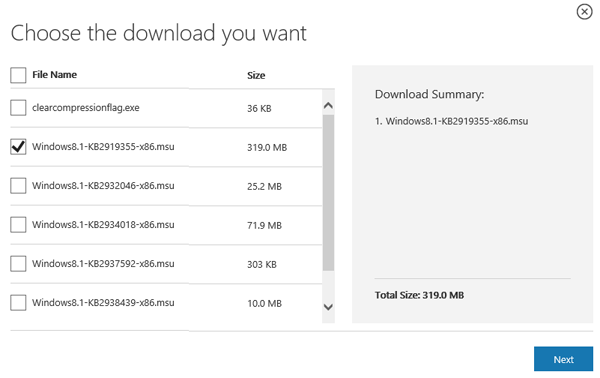 - Windows 8.1 更新包含六個單獨的文件:clearcompressionflag.exe、KB2919355、KB2932046、KB2934018、KB2937592 和 KB2938439。您只需選擇包含 KB2919355 的文件並單擊下一個開始下載。